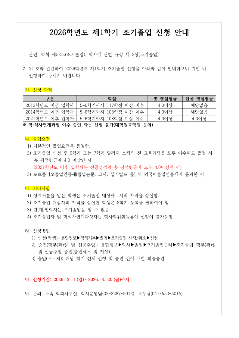 - [교무처] 2026학년도 제1학기 조기졸업 신청 안내
